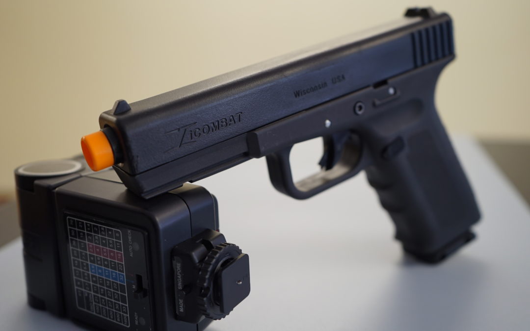 The iCOMBAT system consists of three main parts: an IR weapon (irM4 or irPistol), irVest, and Smartmag. The irPistol mimics a real Glock-style handgun in form, fit, and function (aside from being a firearm). The irVest is a standard MOLLE vest that houses electronics for receiving shots from the weapons. The Smartmag powers the weapons and keeps track of ammunition count. The irM4 rifle and the irPistol both have NON-FIREARM classification from the ATF.